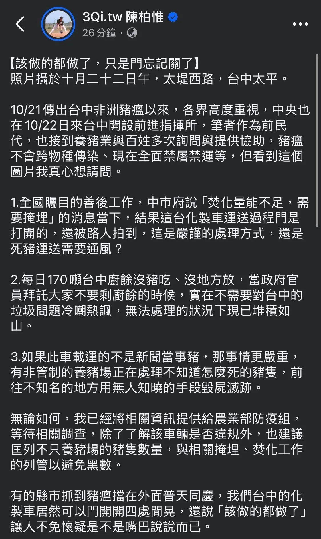[討論] 疑似病死豬載運車出現在太平街頭?來源:陳柏惟臉書 拍攝地點:台中太平ㄧ太堤西路ㄧ10/22中午 運豬車在運送過程中車門開啟?若非新聞當事豬,那這些非管制養豬場的病死豬是哪來的? 要送往哪裡?![[討論] 疑似病死豬載運車出現在太平街頭? [討論] 疑似病死豬載運車出現在太平街頭?](https://i.imgur.com/uucyc9Fb.jpeg)