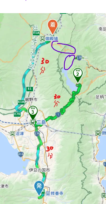 謝謝回覆的各位 Day5修善寺完會回三島飯店拿行李 之後會先在長泉那區域吃午餐 午餐完再去御殿場 原先的想法是三島到箱根.修善寺.御殿場的車程大約都30-40分左右 還有不確定冬季 下圖中紫色圈起的路段 會不會不好行駛
