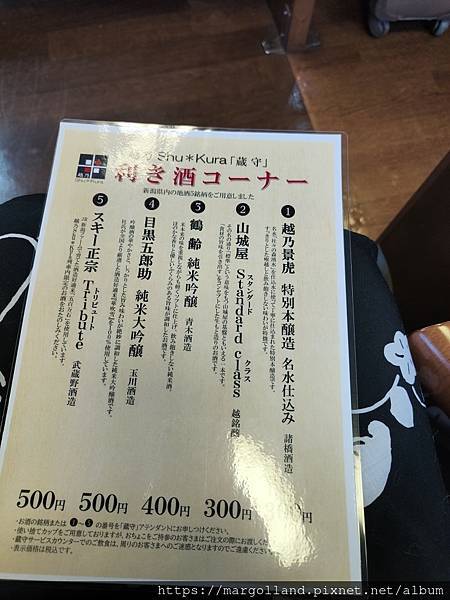 米大吟醸。就我個人試飲的感想,一號選手因為不是純米酒,雖然在精米上有達到吟釀等級,由於有添加釀造酒精,飲用時的酒精感還是比較明顯,喝起來雖然順口不嗆,對於習慣純米酒的瑪歌有點不太適應,但是比較喜歡酒感重的人,說不定會覺得比較上頭,個人覺得是適合在居酒屋搭配燒烤的清酒。二號選手是經過雪藏的純米大吟釀,跟三號君之井的山廢純米大吟釀其實差距不大,但根據目前還留有的印象,個人喜歡君之井的山廢大於越の寒中梅,可能是山廢的作法使得純米大吟釀的味道層次更豐富了一點,有時候過度精米,其實也會讓味道有點太過「純粹」而單調化。不過由於之前在越後湯澤的白瀧酒造已經帶了一堆清酒,實在無法再多買酒了,反正在列車有欣賞到就好了,有機會來的人,可以考慮帶支聯名酒回去品嚐看看。