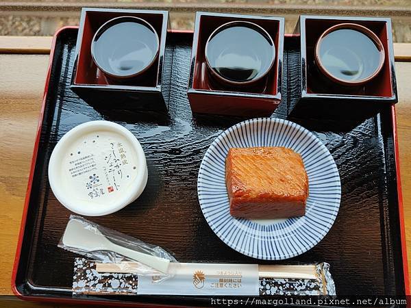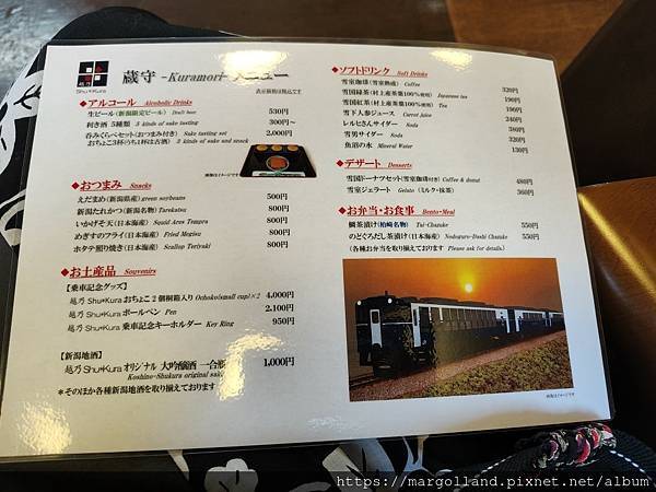 列車上販賣的東西,大概只有柏崎名物鯛茶漬け很快就完售,其他都有的買。我們選了大家推薦的燒鮭+清酒三種試飲組合¥2000,列車上的燒鮭真的超級好吃,味道濃郁但是鹹甜適中,妨e在越後湯澤也買過其他牌子的燒鮭當下酒菜,都沒有列車上的好吃。瑪歌