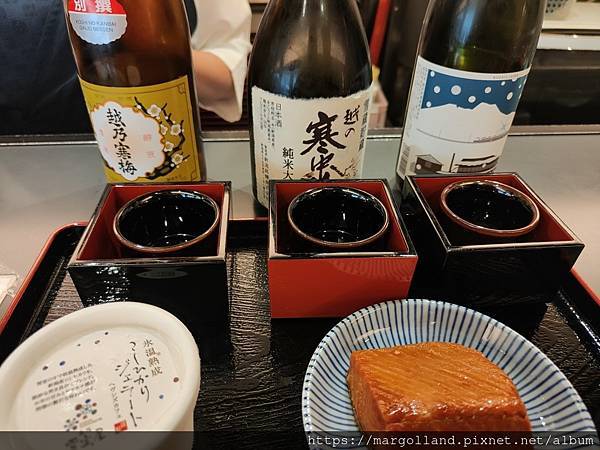 這三種試飲清酒,服務人員倒酒前都會很上道讓你的手機先享用拍拍照,然後倒滿多到外面的樽大概還有半杯的份量。今天的酒由左到右是:1.V乃寒梅吟釀別撰、2. 新潟銘