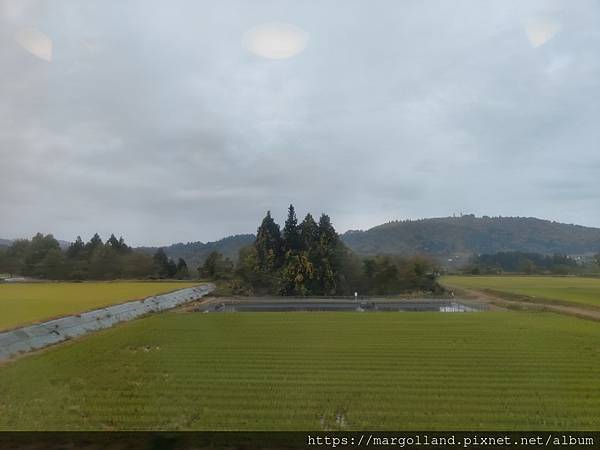 但是說實話,越乃列車行經的路上都挺鄉下,路上看出去都是稻田。搭車途中會有免費試飲的酒,不過只有一種,今天是十日町當地魚沼酒造的「天神囃子」特別本釀造,酒精味還是挺明顯的,所以後來服務人員來第二趟的時候,都沒啥人再續杯。