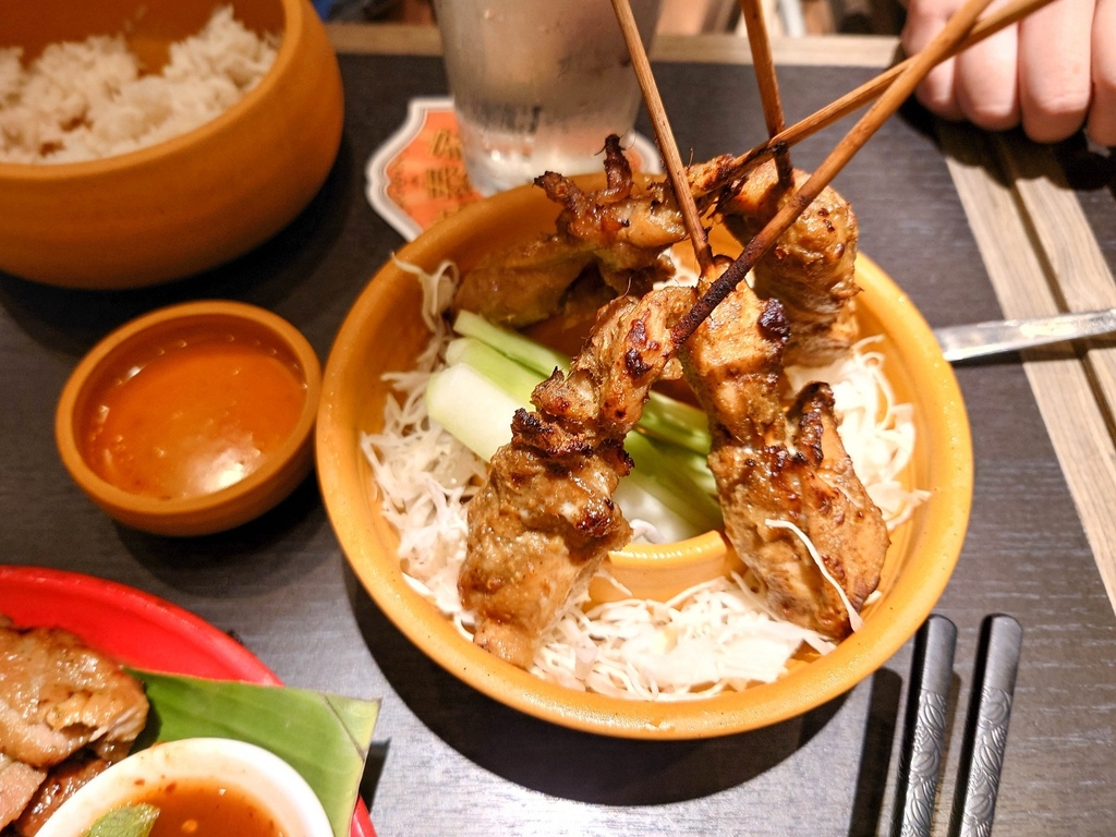 沾上以羅望子汁、棕梠糖、辛香料熬煮的醬汁蠻好吃的。