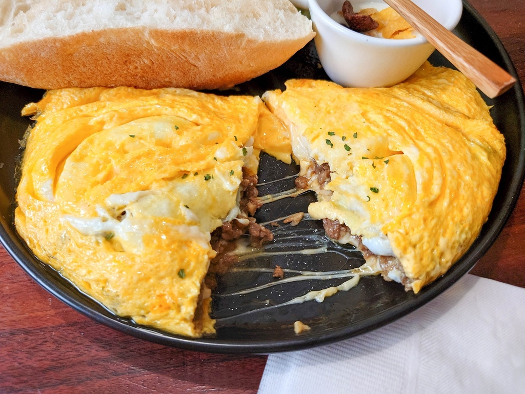 歐姆蛋包著炒美國牛漢堡肉、切達起司、莫札瑞拉起司、帕瑪森起司、傑克起司,