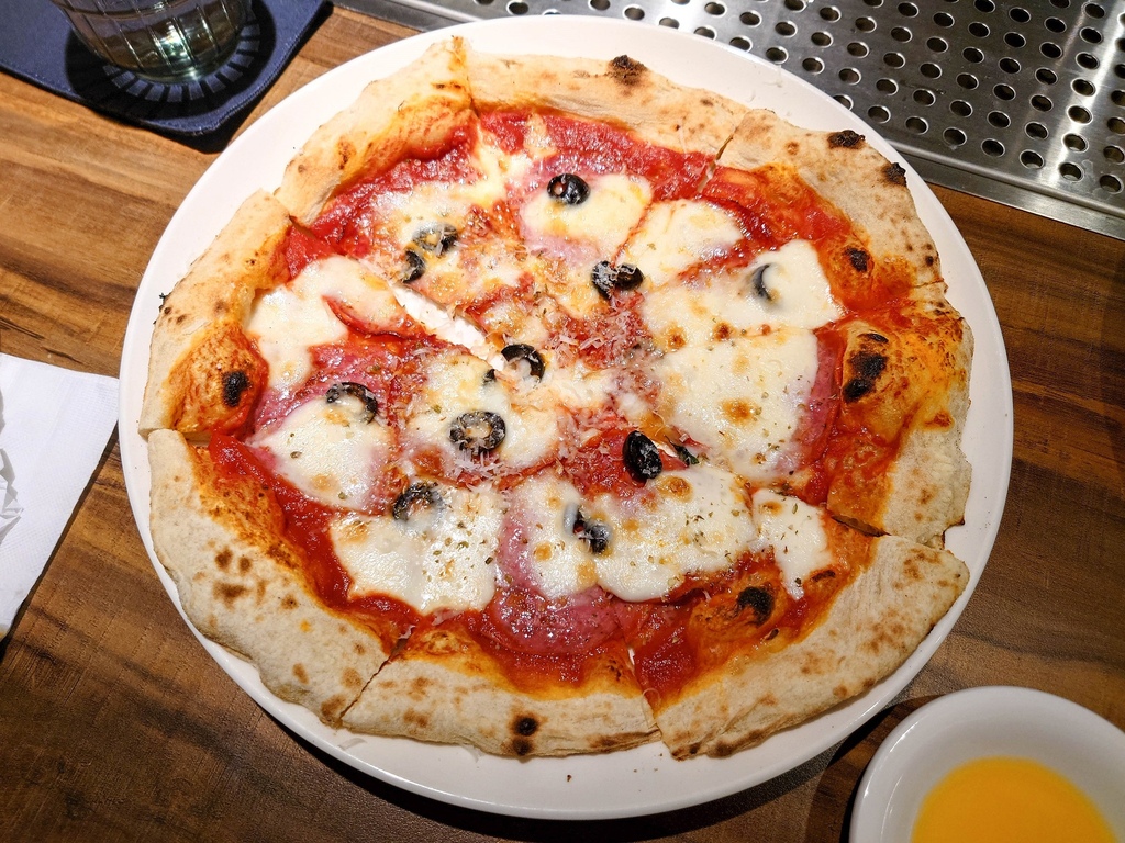 有義式臘腸、黑橄欖、莫札瑞拉起司、番茄紅醬,