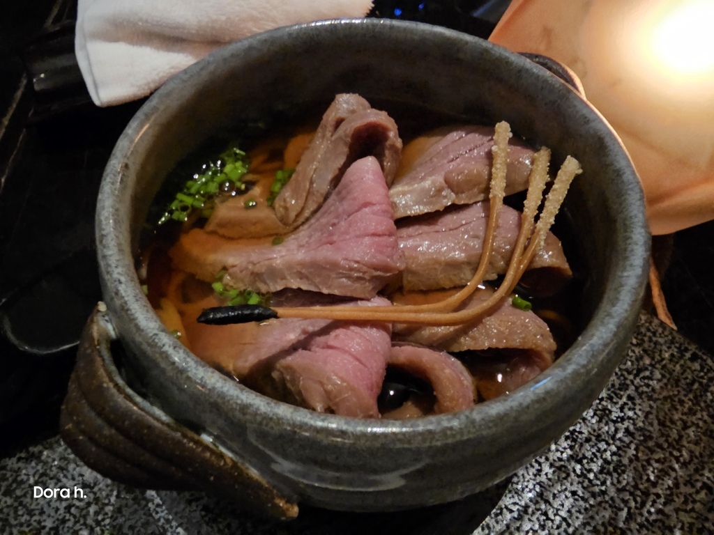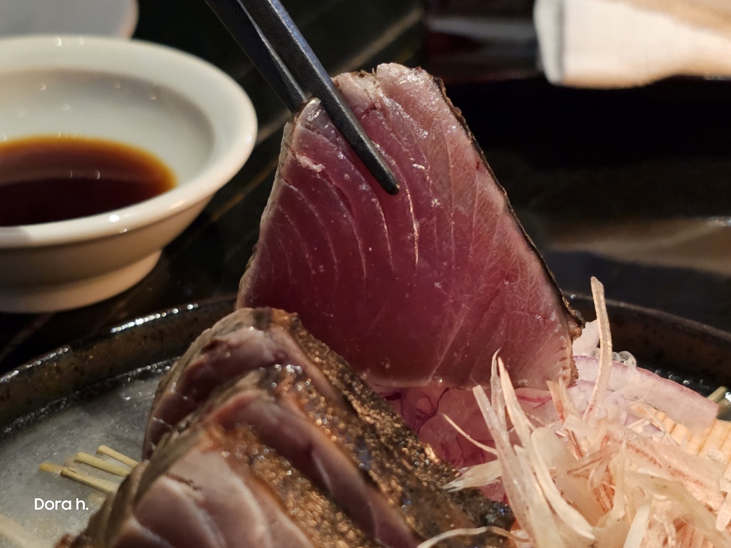 第一盤就來點個WA-RA的代表,厚實的鰹魚生魚片外層,被藁燒的手法薰上一層棕黑色的稻草顏色;所謂的半敲燒,係來自江戶時期的土佐藩 (今高知縣),有鰹魚王國之稱。