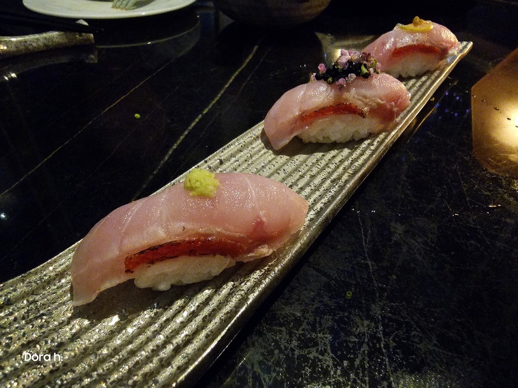 上頭分別加上芥末、花碎和魚子醬、黃金柚子味噌,相當可口。金目鯛的口感又比前面的鰹魚更軟嫩一些,可以輕易咬斷。