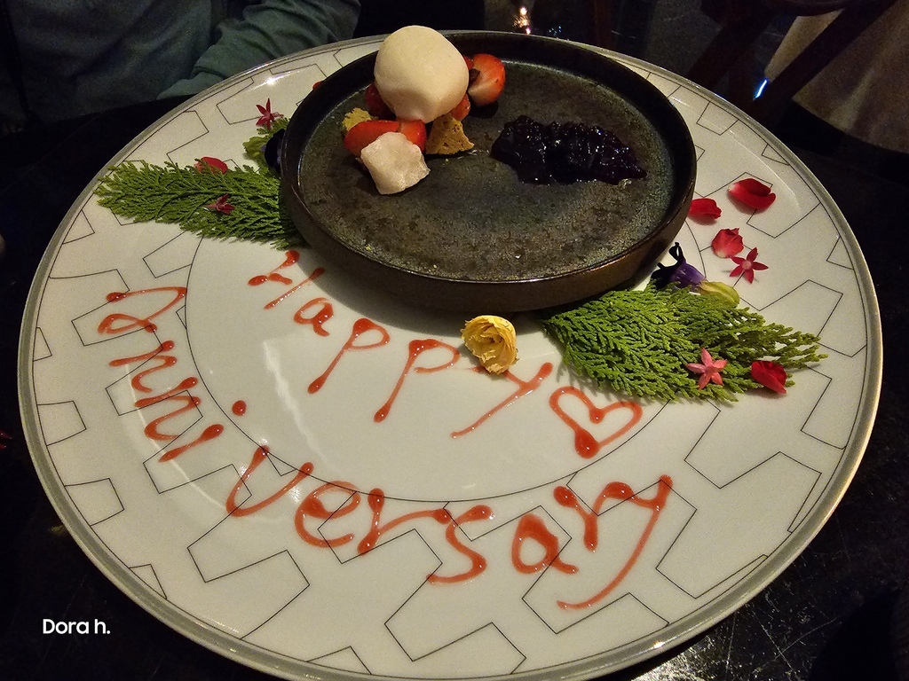 真正儀式感的來了。冰淇淋本身是酒粕風味,旁邊點綴著新鮮果瓣與莓果醬。