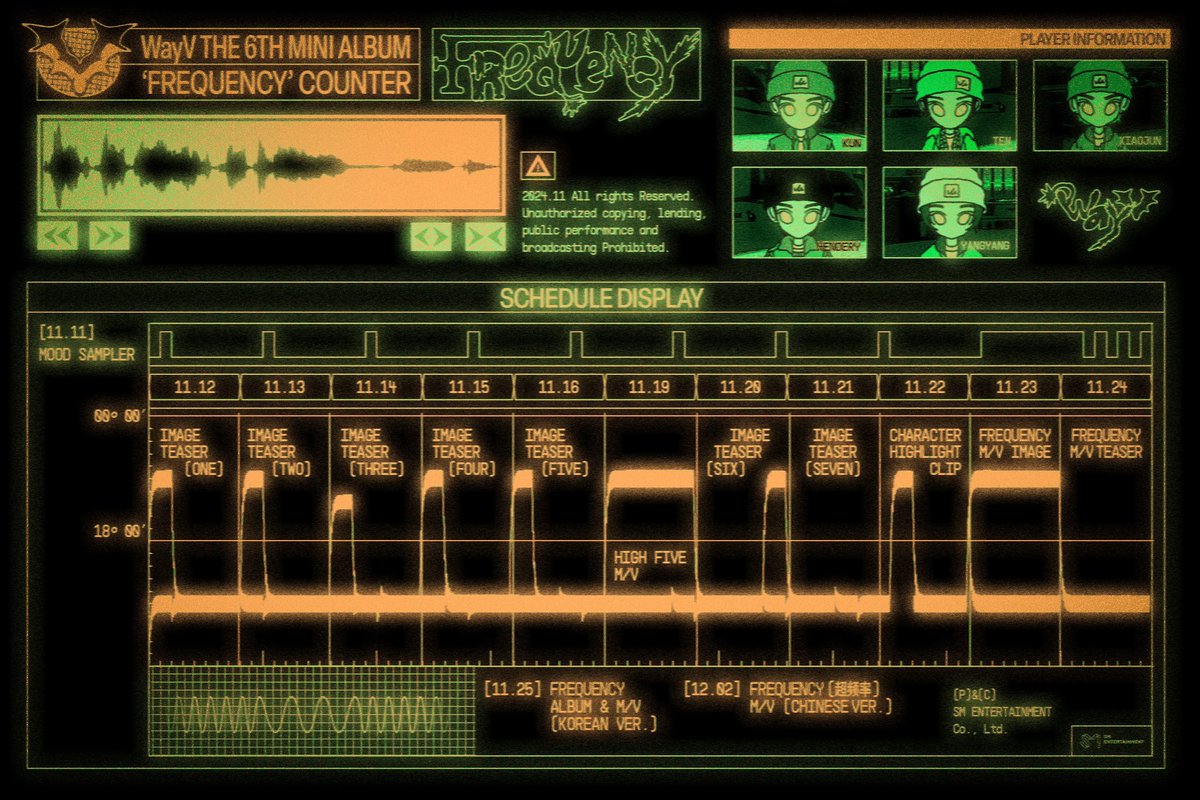 威神V第六張迷你專輯《FREQUENCY》由主打歌《FREQUENCY》韓文及中文版本、先行曲《HIGH FIVE》、收錄曲《TWIST》、《Filthy Rich》、《Call Me》等6首歌曲組成,充分展現出威神V的新音樂色彩;先行曲《HIGH FIVE》於2024年11月19日公開,迷你專輯《FREQUENCY》於2024年11月25日正式發行。