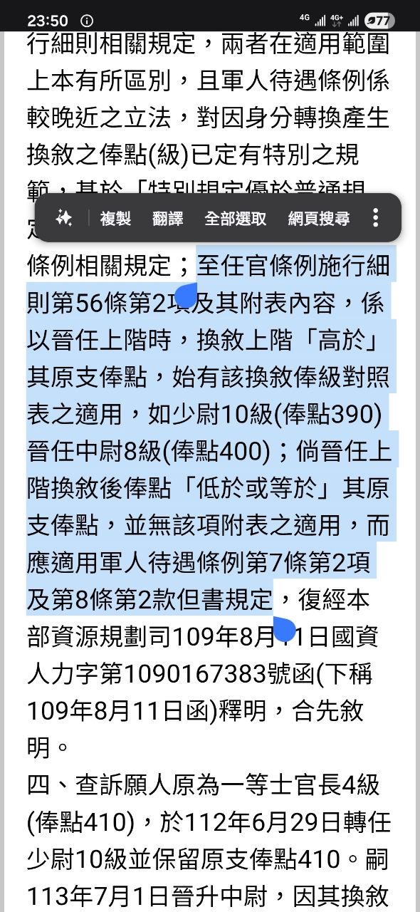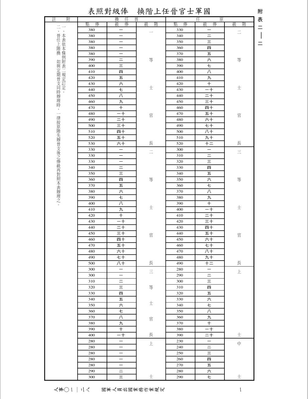 過去大家都是用陸海空軍軍官士官任官條例施行細則內的換敘表去換敘 軍人待遇條例也寫明晉任上階換敘時,不低於原支俸點之俸級 為何經資源司釋疑後不低 於變成等於? 大家依任官施行細則的換敘表去換敘也直接變成錯的?
