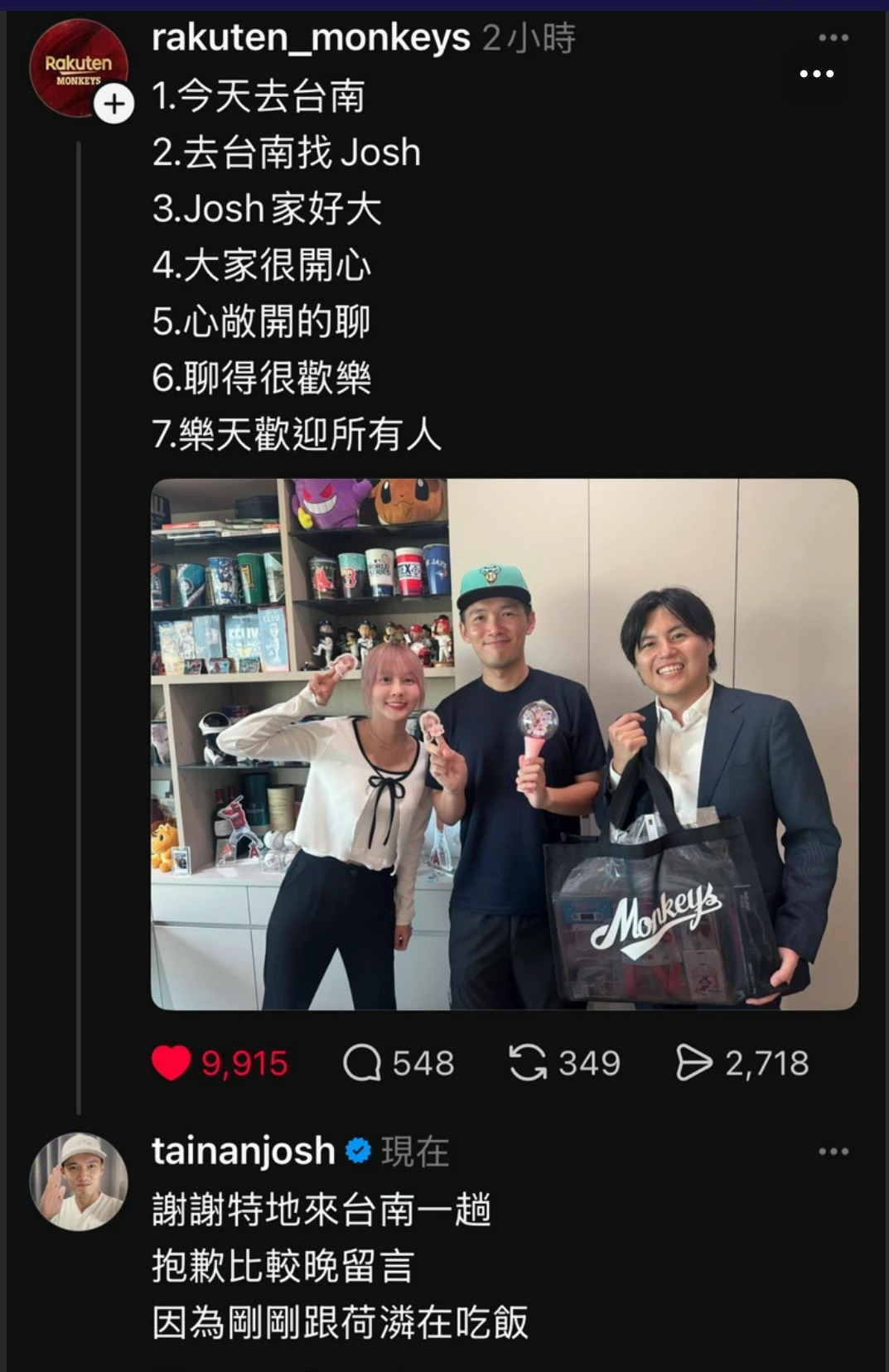 以及樂天桃猿營運處處長和田翔太,一起帶禮物前往台南登門拜訪