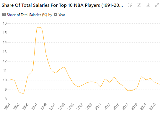 聯盟中收入最高的 10 名球員在 NBA 薪資支出總額中所佔的份額