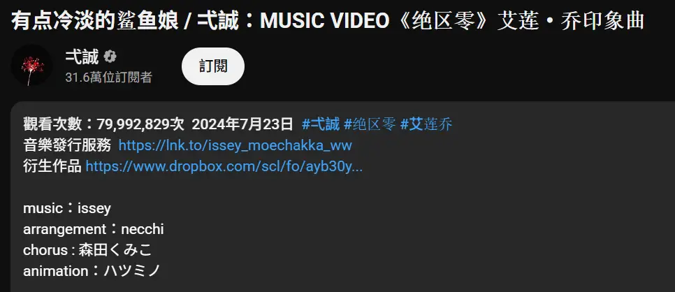 除此之外,鯊魚妹的YT本家MV也即將突破8000萬播放大關