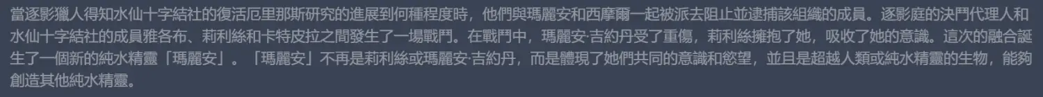 在追捕的過程中瑪麗安與莉莉絲融合變成純水精靈,就是我們任務看到的瑪莉安
