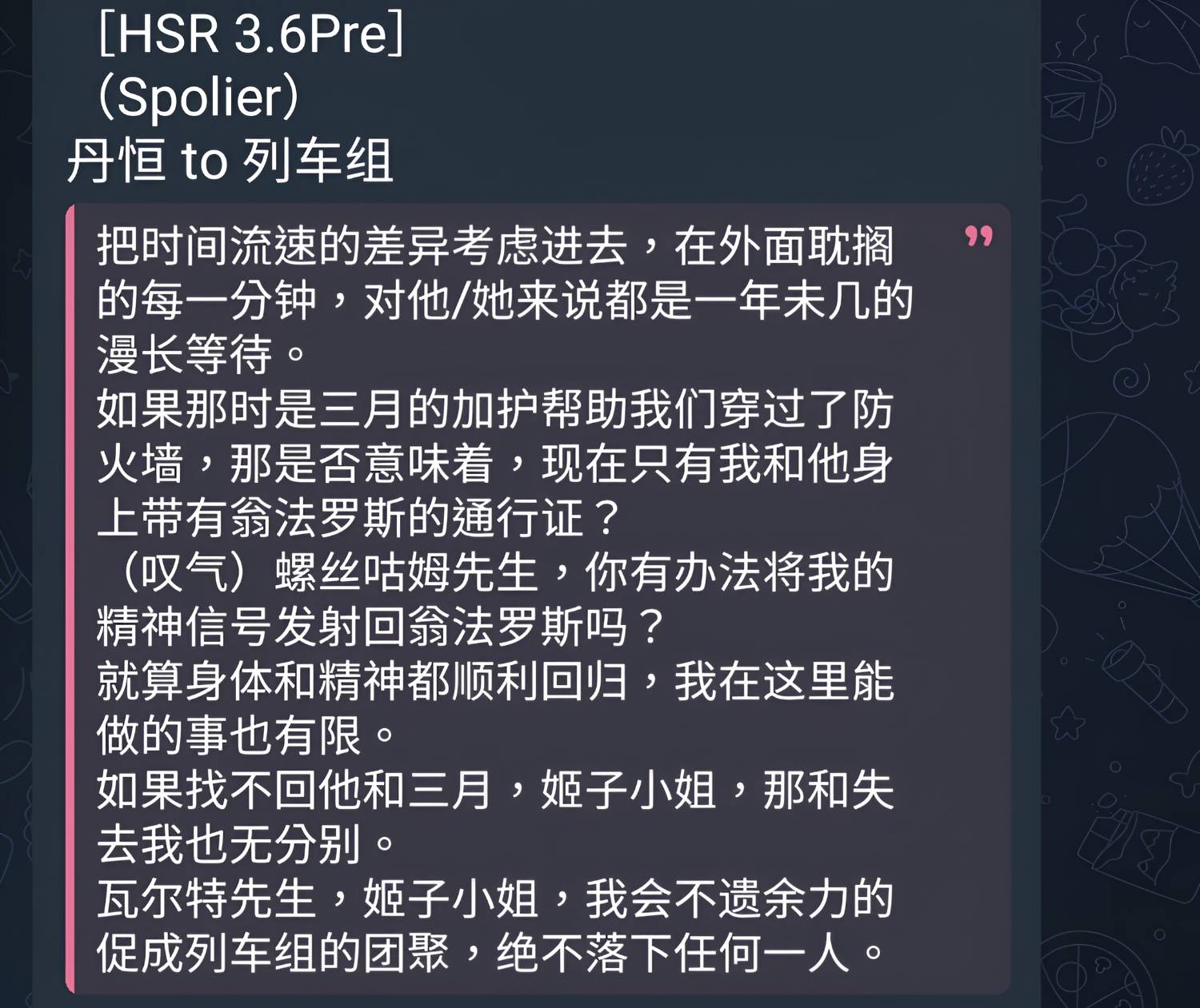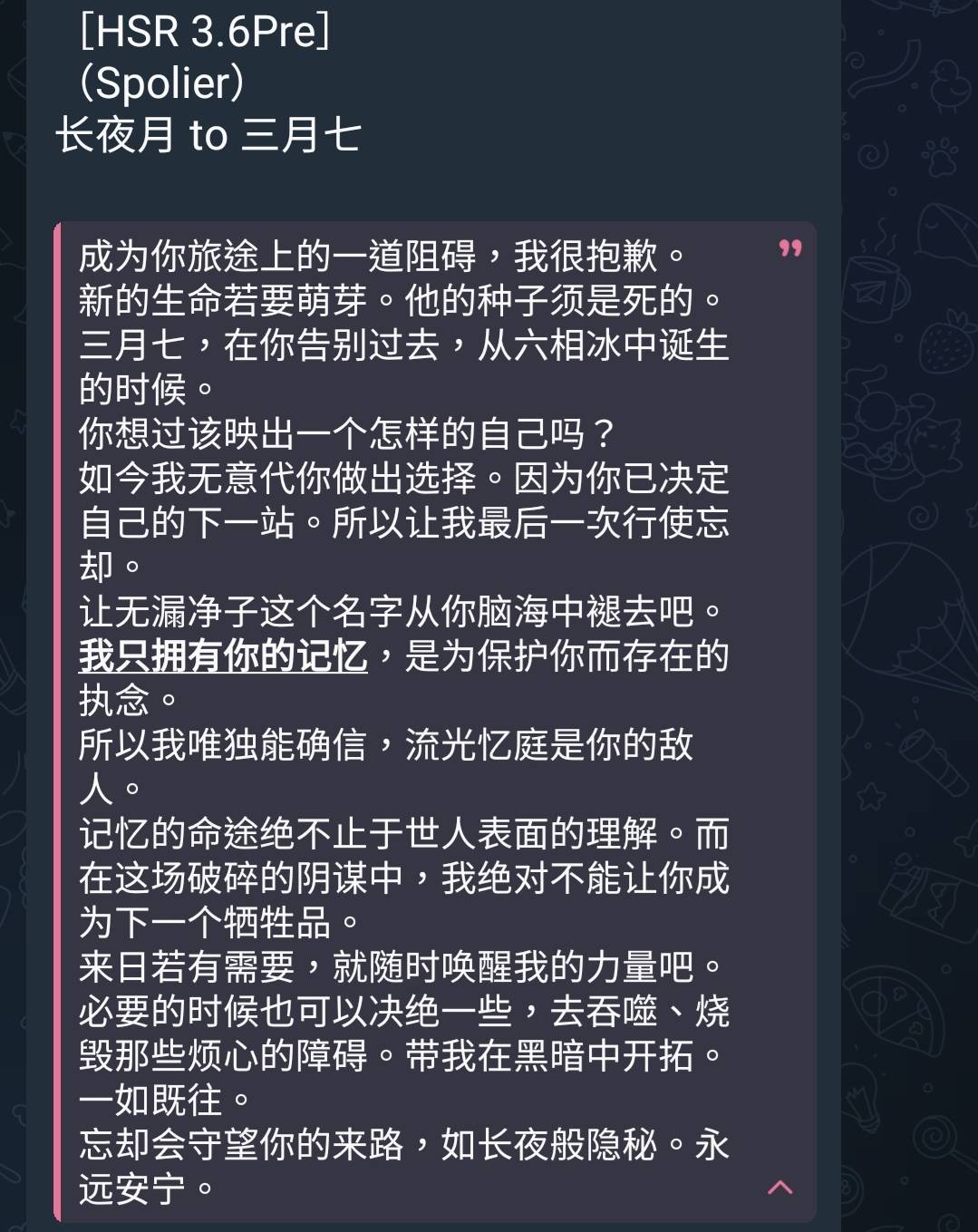Re: [鐵道] 翁法羅斯英雄紀 長夜月立繪現在已經有關於長夜月的解析 光是立繪和文本就有不少資訊可以挖 像是文本在解析後被認為是長夜月在對三月七說話 三月七應該是在立繪的鏡子中(沒有畫出來) 長夜月對三月七的態度則是"不惜代價都要保護"