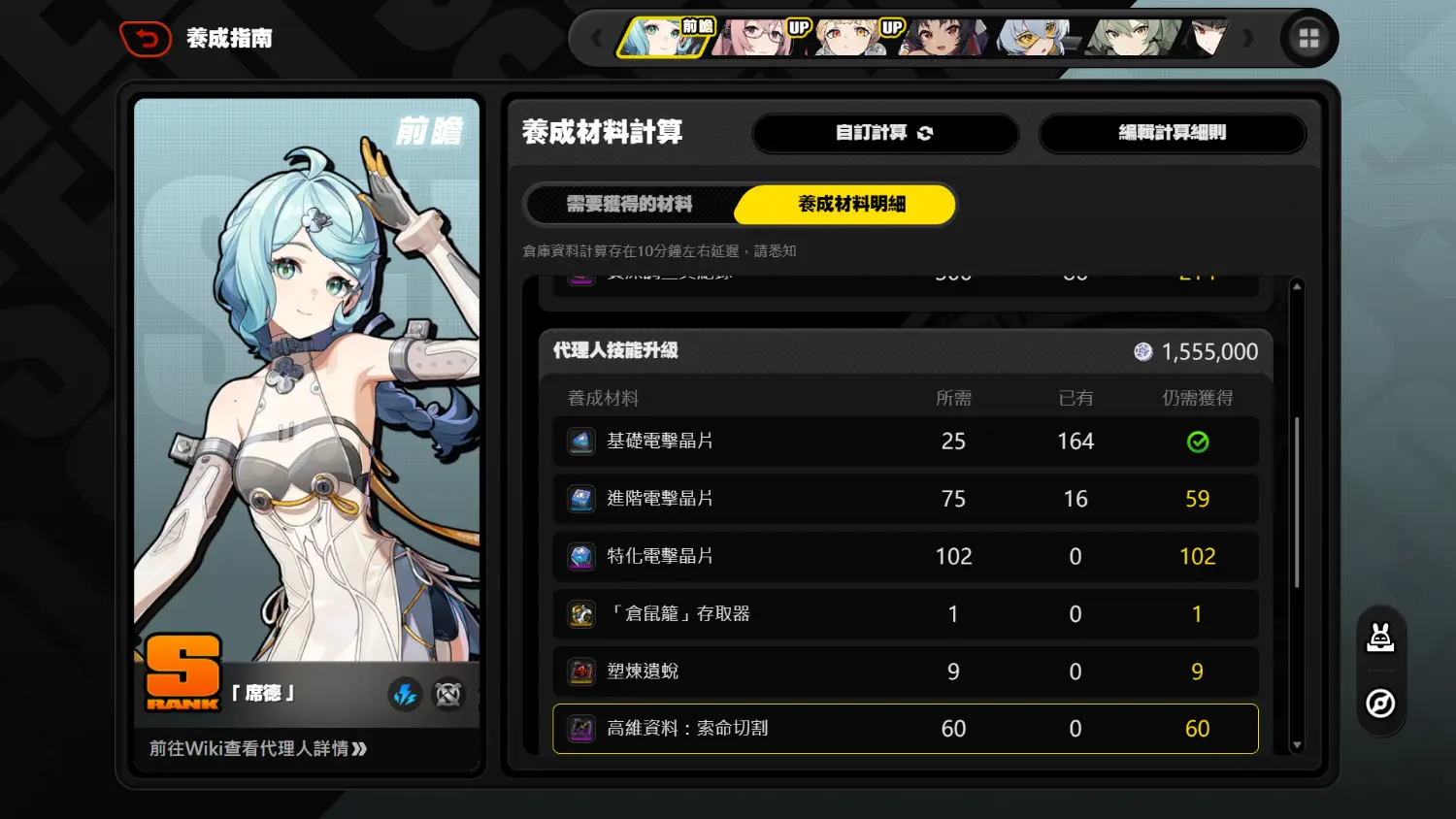 材料都屬於溢出狀態,屬於一來新角色都直接全技能能